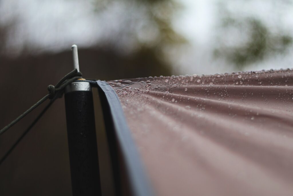 雨や風の強い日には、タープの張り方を少し工夫するだけで快適さが増します。基本は「低く張って、しっかり固定する」こと。