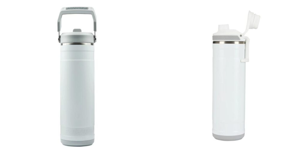 ストロー飲み口付きのスクリュー式フタ。TPRグリップ付きスイングハンドルで持ち運びも快適!(CHUGはフリップ開閉式)
