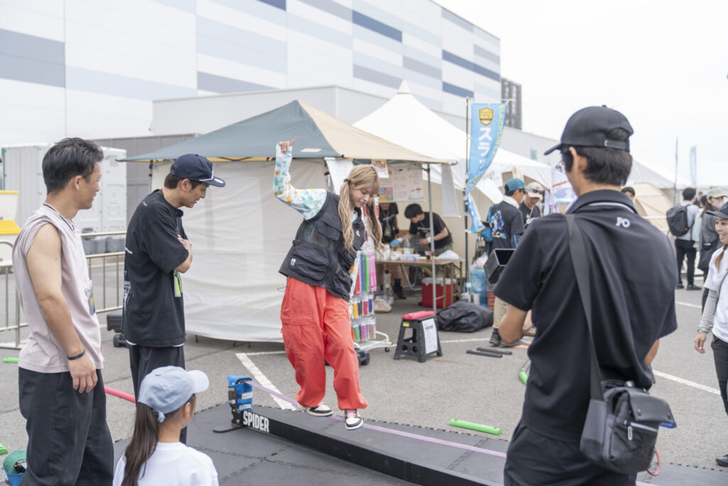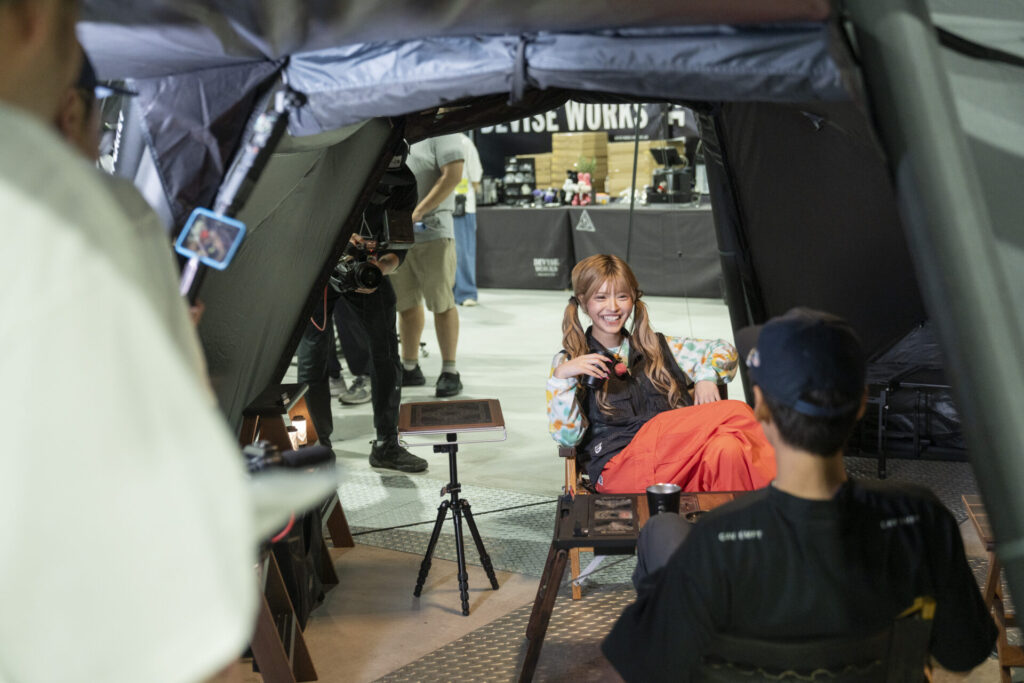 ギアの展示や販売だけでなく、大人も子どもも楽しめるアクティビティが充実しているので、キャンプ初心者のアンジェリカさんも楽しんでいる様子。