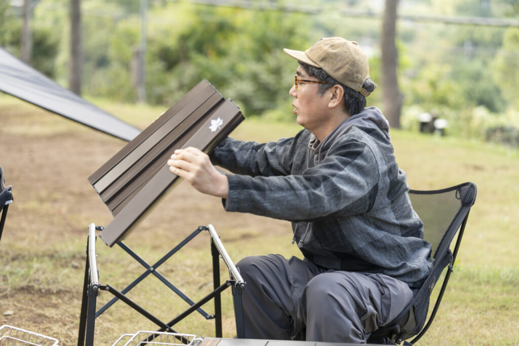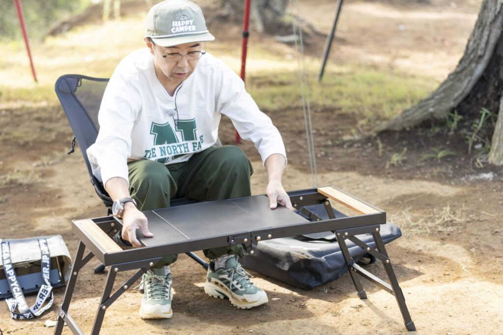 丸洗いアジャスタテーブルMは高さ調節も可能で、今回はFoldFlex Tableよりも少し高めにして作業台に。その時々の使い道に合わせて、高さが調整できるだけで、キャンプの過ごしやすさはグッと変わります。