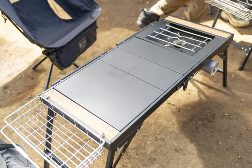 今回はテーブルにバスケットとバーナーをセット。バスケットには調理器具や調味料、テーブル上では食材を切ったり混ぜたり、バーナーではフライパンや鍋を火にかけたりなど、これ一台でキッチンが成立してしまう優れもの。自分の使い道に合わせて、最適なカスタムの追求も楽しめます。