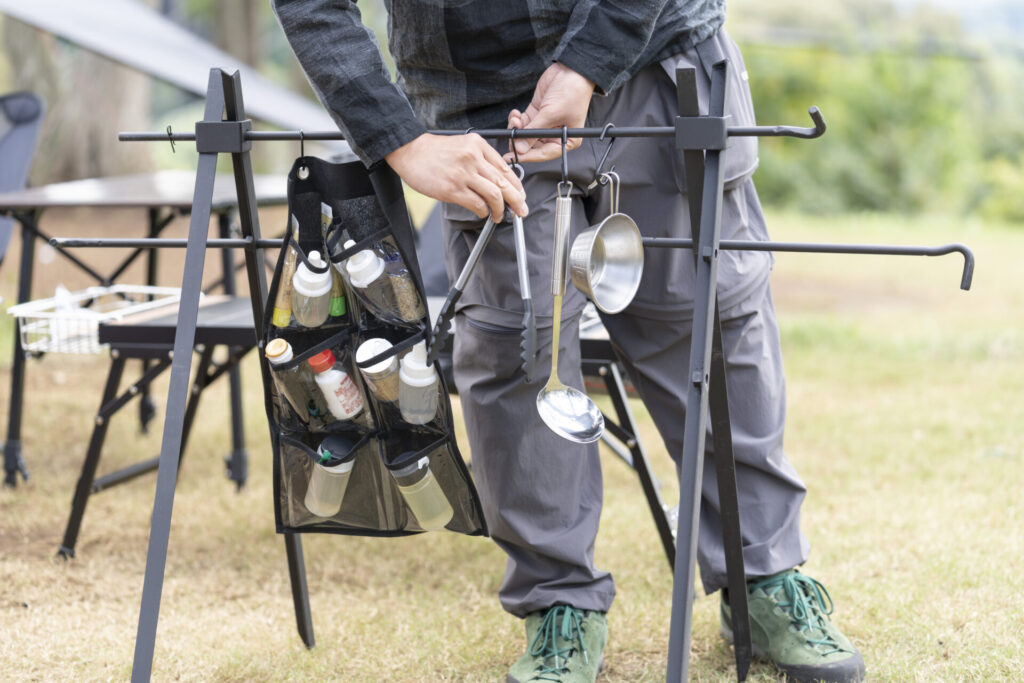 尾上製作所からは吊り下げ収納に便利な「マルチハンガー」も登場。付属のS字フックを使って、調理ギアを掛けたり、今回は壁掛けポケットを使い調味料収納としても活躍していました。