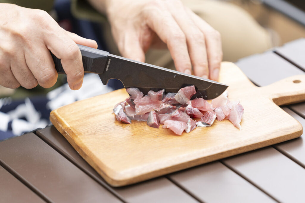 デルタターロンの凄さは、ブッシュクラフトナイフとしてだけでなく、包丁としても使えてしまうその切れ味。今回は魚を切るのに使いましたが、その柔らかい肉を潰すことなく、ちゃんと切ることができています。調理から薪割りまでなんでも来い!なナイフです。