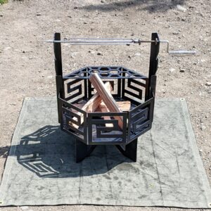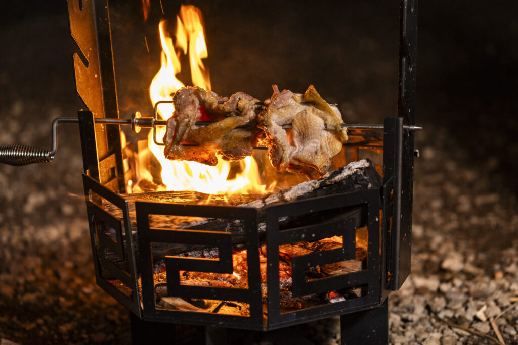 焚き火台横に設置された支柱に焼き串を引っ掛けて、火の上でくるくると回しながらお肉を焼くことができます。某怪物狩猟系ゲームの調理シーンをリアルに再現できる、夢のような焚き火台です。