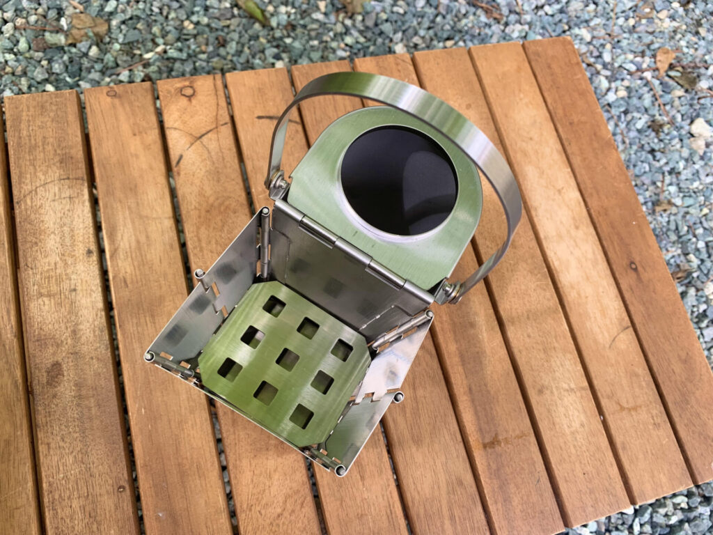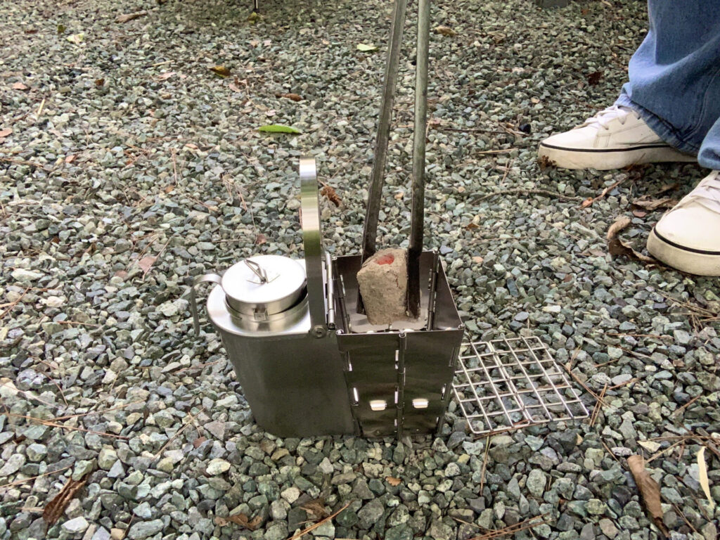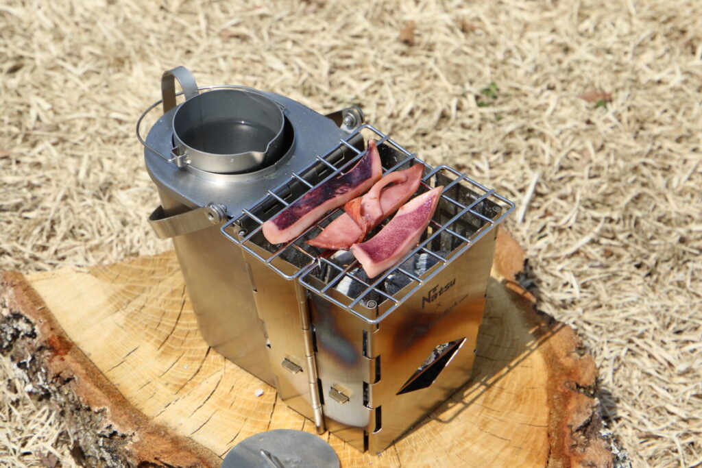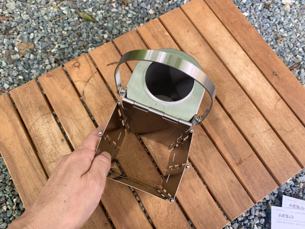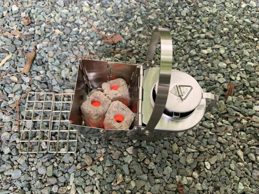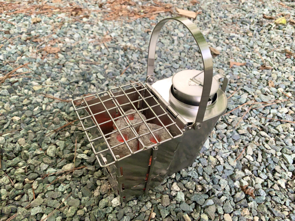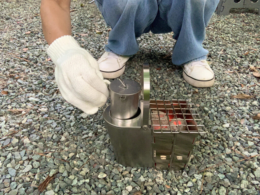 今回は地面に置いて使用しましたが、この炉は炭床が二重構造のため熱が伝わりにくく、木製テーブルの上でも使用可能です。