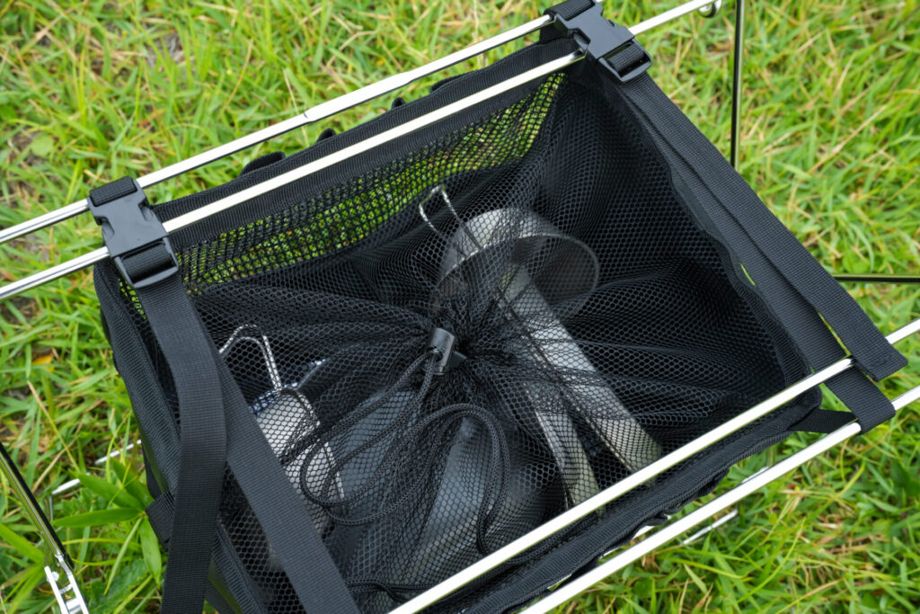 濡れた食器を乾かせるメッシュ素材のバッグ『エアドライ ハンギングシェルフ』は、水が流れ落ちる設計です。
