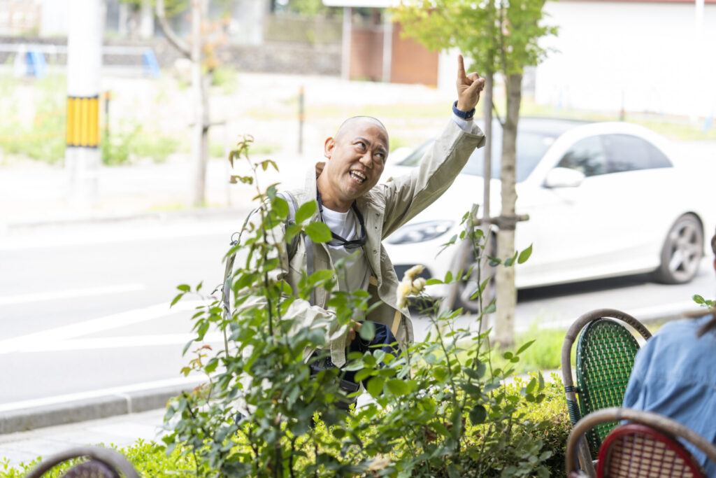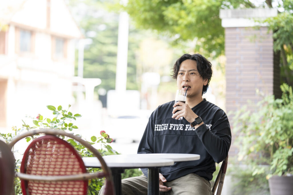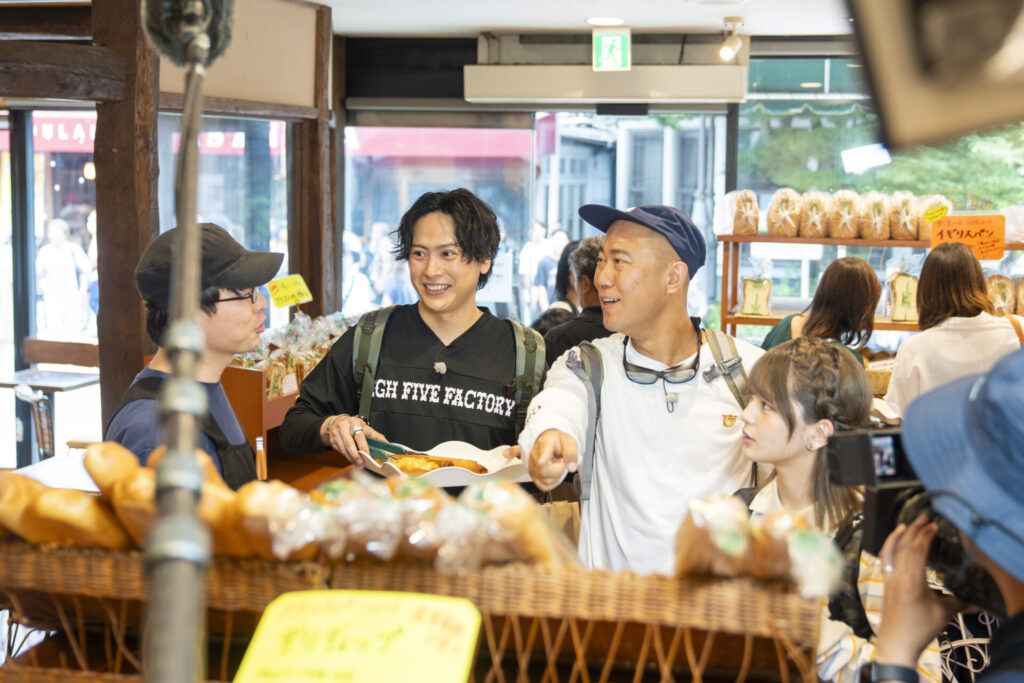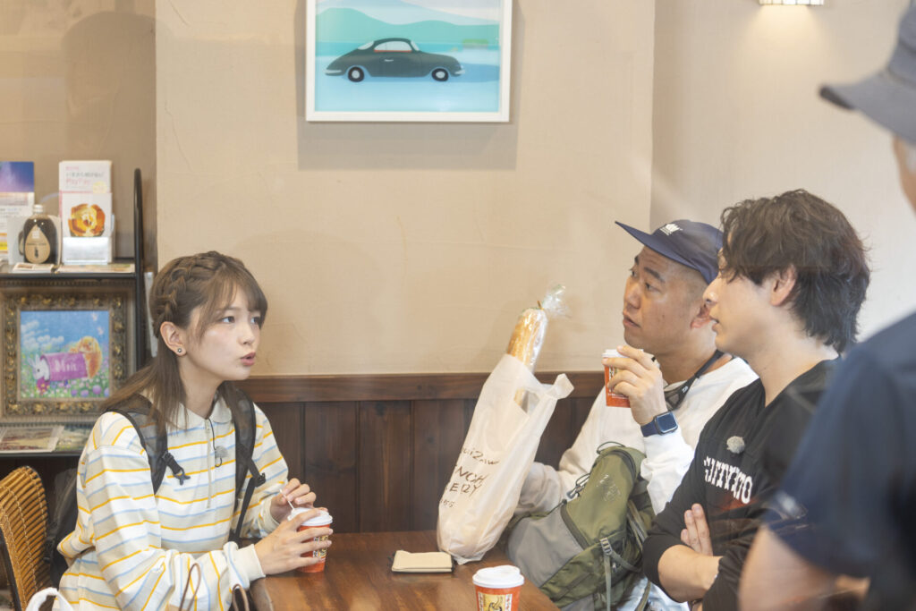 おしゃれなパン屋さんでくつろぐ山下健二郎さん。すると、今日一緒に旅をするメンバーがやってきました。