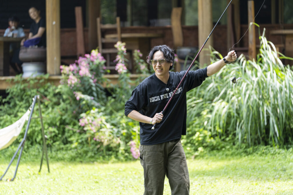 今夜コテージで食べる分を釣るべく、3人は真剣な表情で竿を構えます。限られた時間の中で魚を釣らなければいけないため、集中力が試されます。