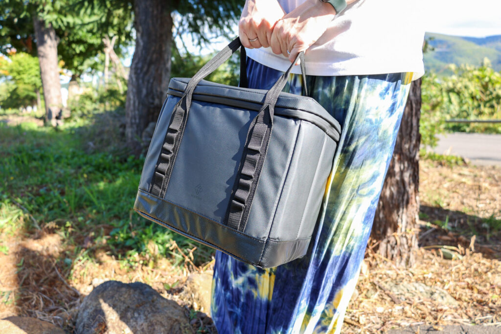 片手で軽々と持ち運べるサイズで、キャンプ場内での移動もラクチンです。また、1泊2日のキャンプで安心して使える容量なので、ソロキャンプからファミリーキャンプまで、幅広いシーンに対応します。