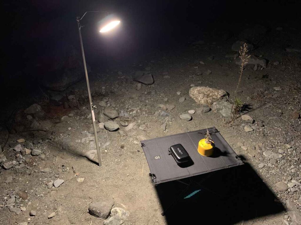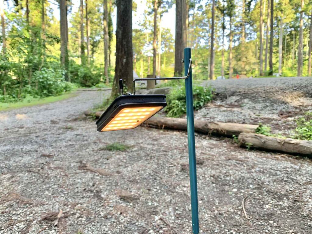 ランタンスタンドを使うと、ランタンを高い位置に設置できます。これにより、光が広範囲に届くようになり、テントサイト全体を明るく照らせるのが美点です。