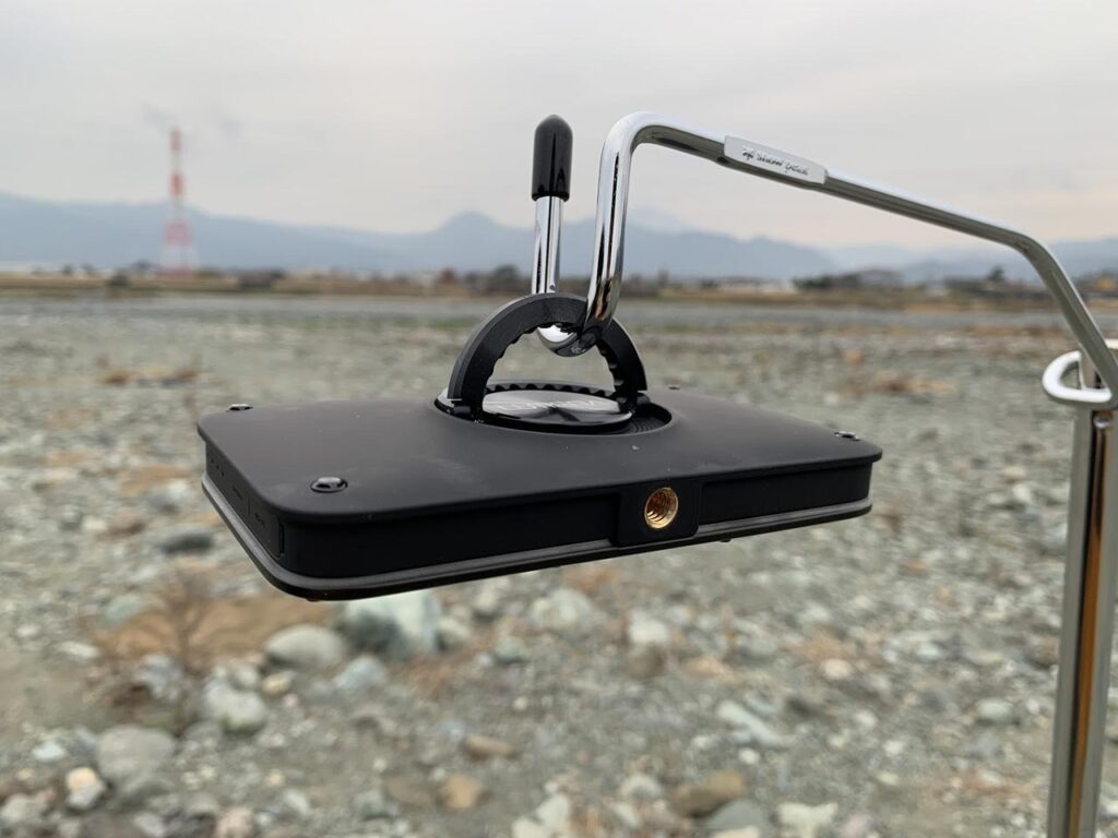 DOD(ディーオーディー)「ココテラスタンド」は厚さ26mmまでのテーブルやラックなどに設置できるクランプ式のランタンスタンドです。