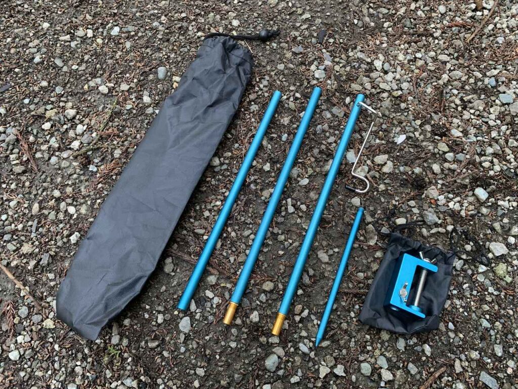 - 素材:ポール・杭・固定具/アルミニウム、フック/ステンレス鋼、ネジ/スチール、フックキャップ/シリコーン樹脂、ポールキャップ/ポリプロピレン、収納袋/ポリエステル・ポリプロピレン