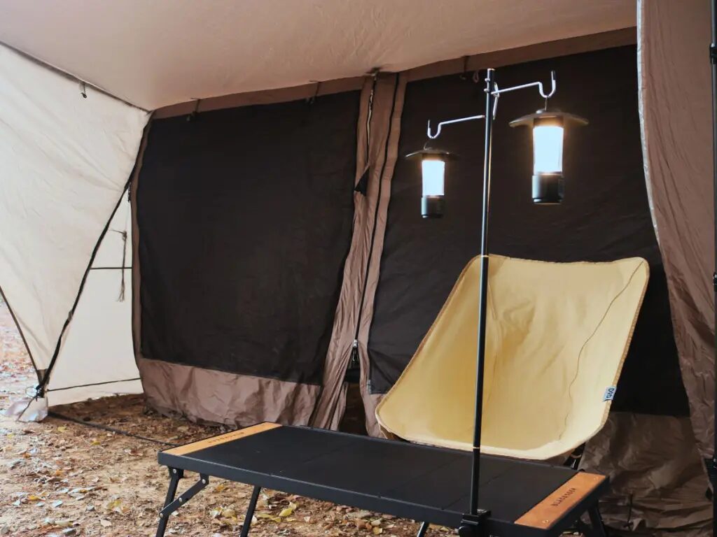 ランタンスタンドを使うと、ランタンの光が広範囲に届き、サイト全体を明るく照らすことができます。