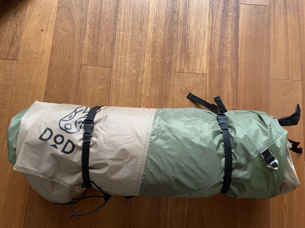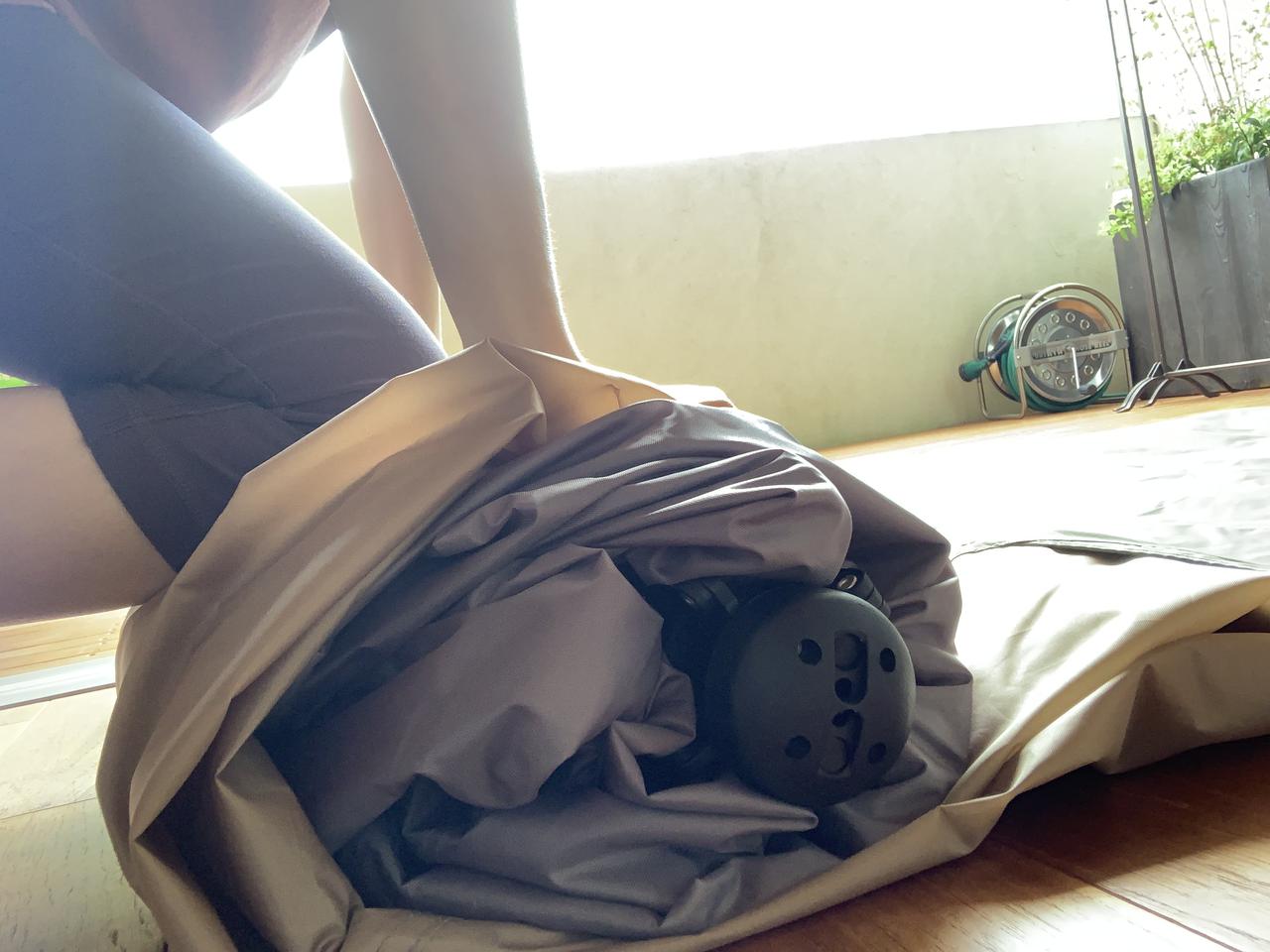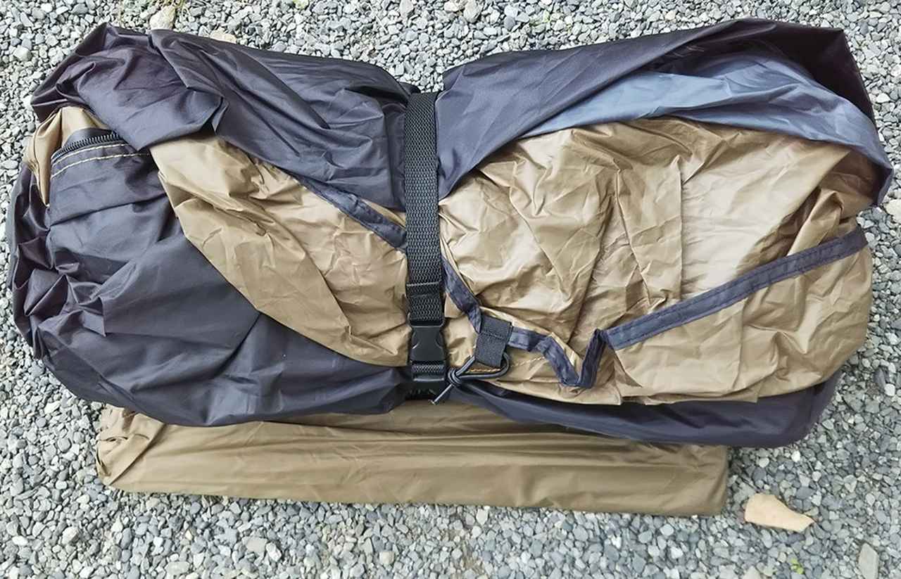 なお、テントは付属のストラップや、別途用意したマジックテープ式のバンドで2〜3ヶ所を仮留めするのがおすすめです。こうすることで、生地が膨らんでくるのを防ぎ、焦らずスムーズに収納袋へ入れることができます。