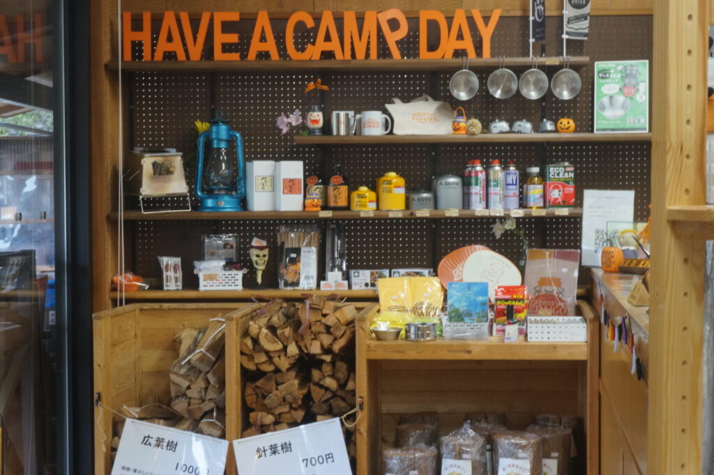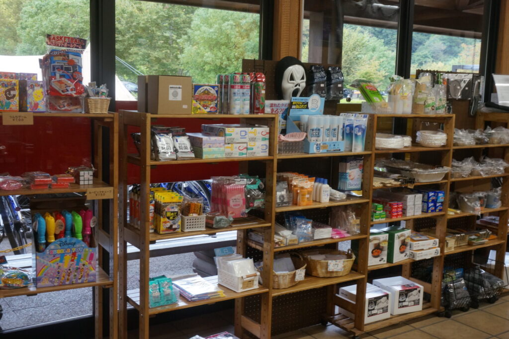 センターハウス内の売店は、グリンヴィラのオリジナルグッズや地酒、薪など充実の品揃え。もし忘れ物をしてしまっても安心です。
