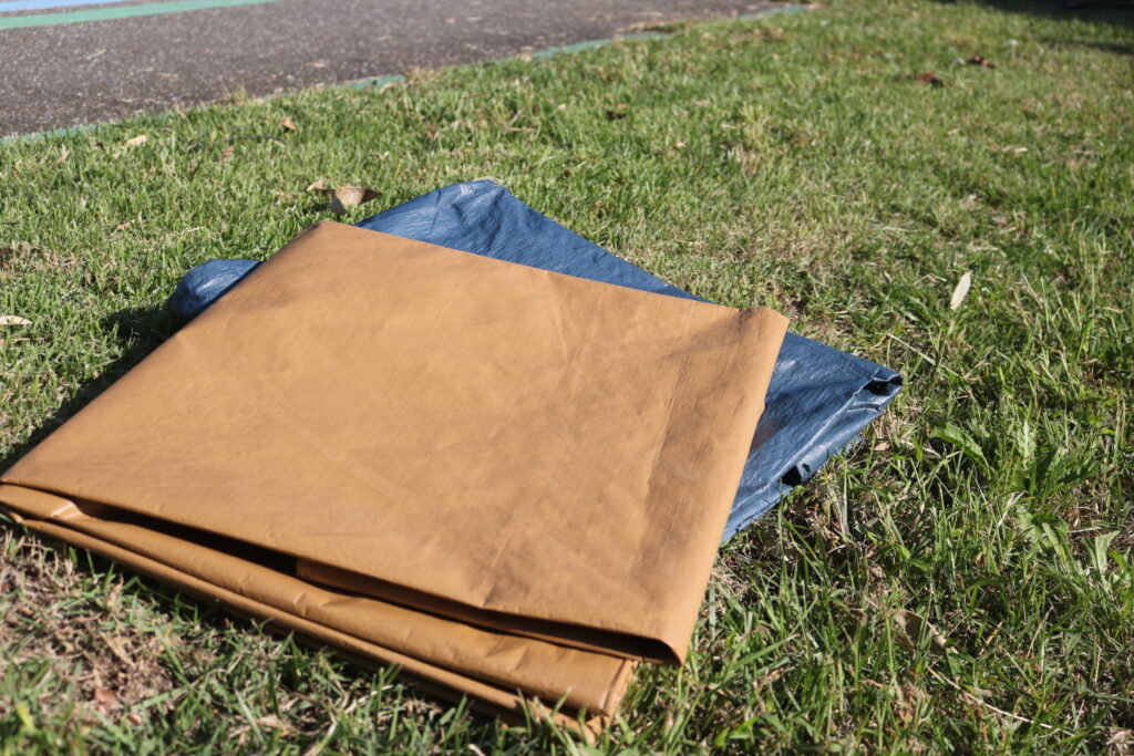 キャンプを始めたころ、ホームセンターでとりあえず買った普通のブルーシート。