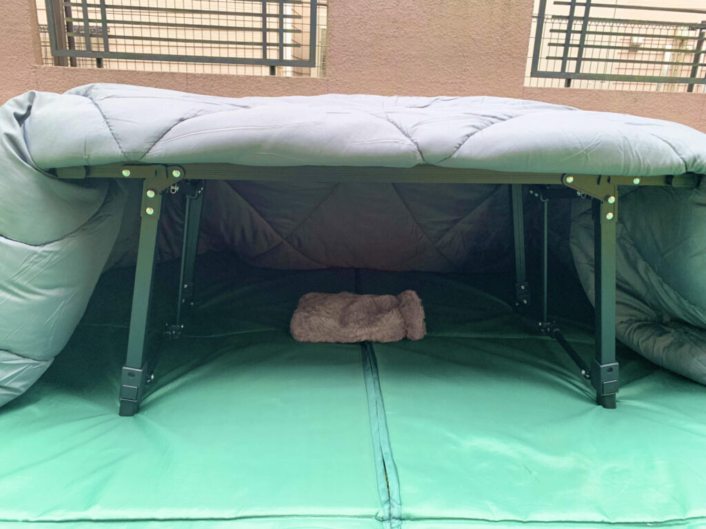 同ブランドのシュラフと同じレベルの保温性を備えた厚手の布団を使用しているため、電源がなくても驚くほど暖かく過ごせるんです。