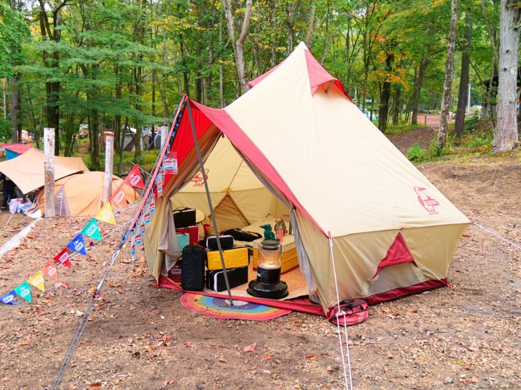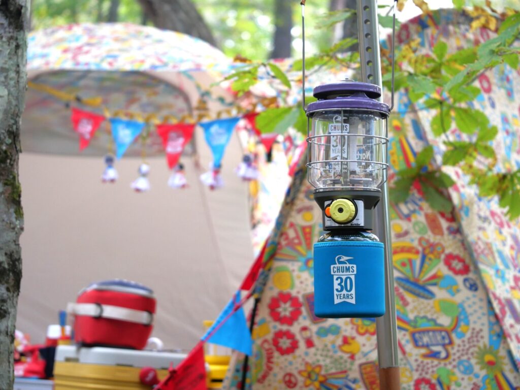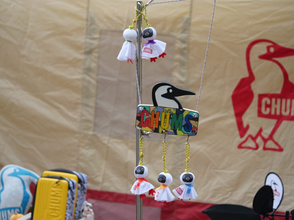 テントはベル型の「ブービーハウス4」。ガーランドや、これまで参加したCHUMS CAMPのステッカーが飾られ、CHUMSらしさがあふれる空間に仕上がっています。