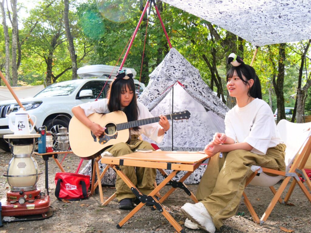 さらに、後ろに見えるテーブルはスケボー板を使ったDIY仕様。細部にまで宿る“こだわり”が、キャンプサイトを唯一無二の空間に仕上げています。