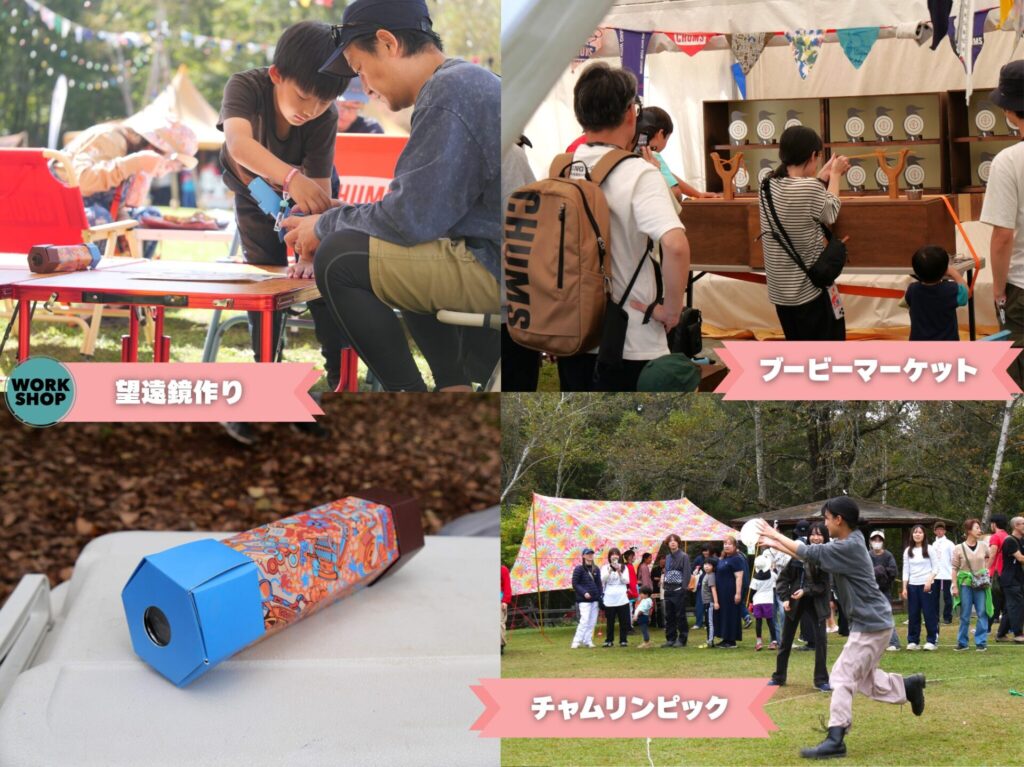 大人も子どもも本気で挑む「チャムリンピック」、景品を狙って射的や斧投げに挑戦する「ブービーマーケット」、望遠鏡やパラコードブレスレット作りのワークショップなど、遊び心満載のコンテンツが勢ぞろい。
