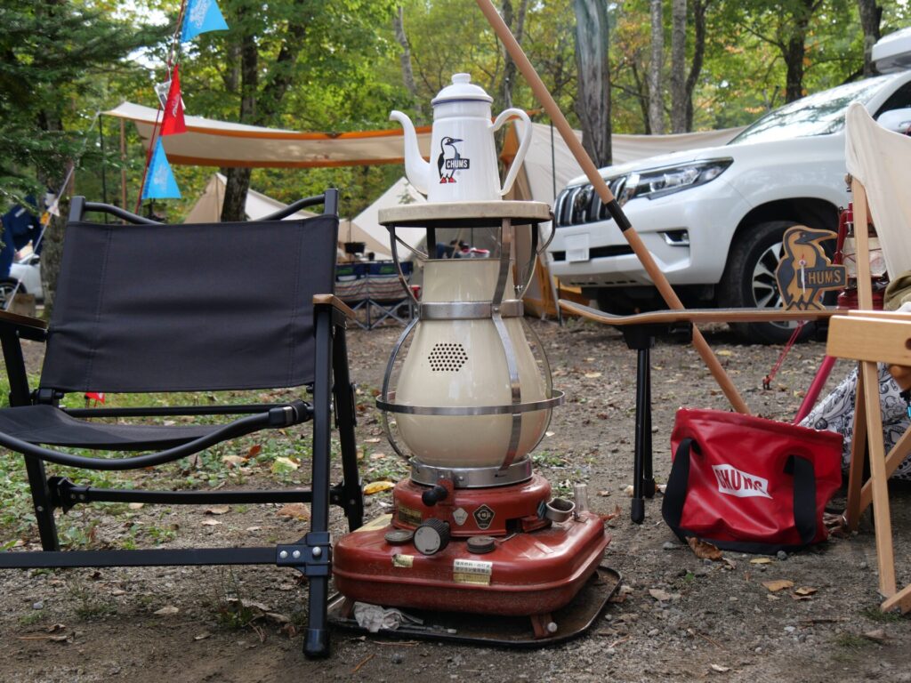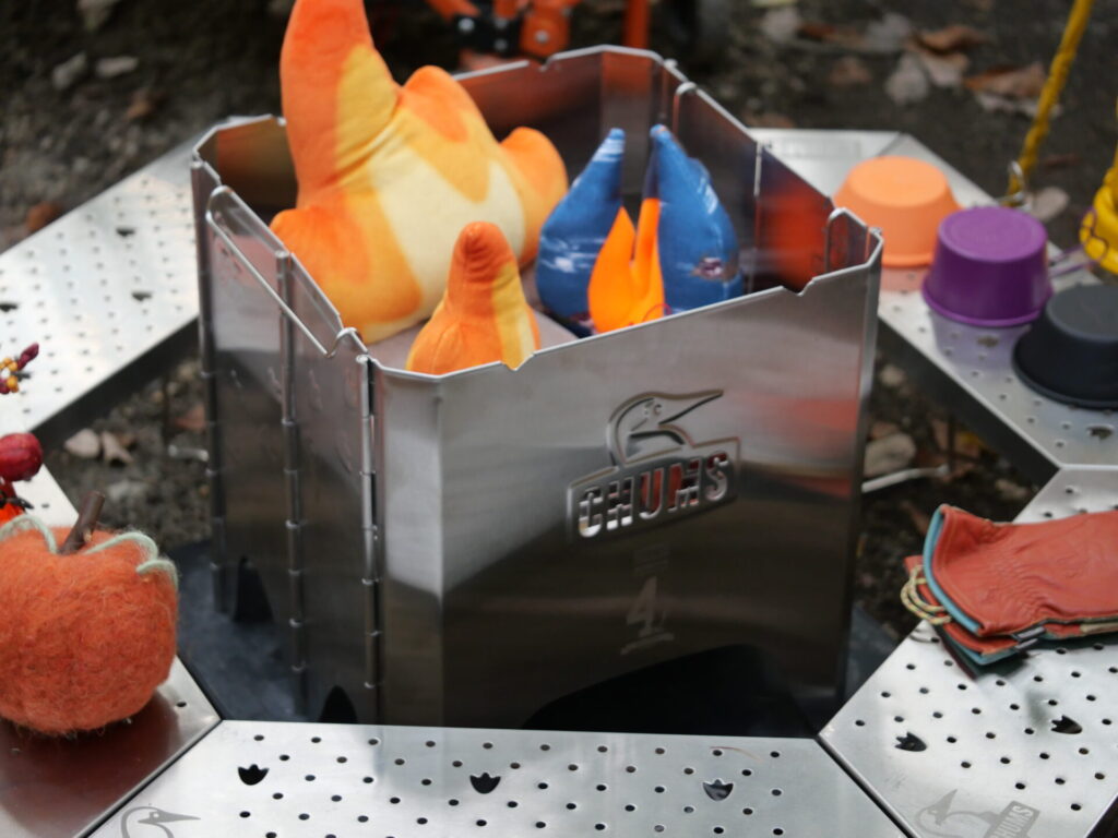 コールマンのヴィンテージバーナーには、CHUMSステッカーを貼ってカスタム。かわいらしさがさく裂しています!