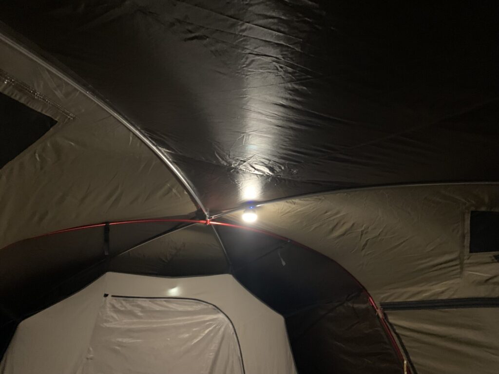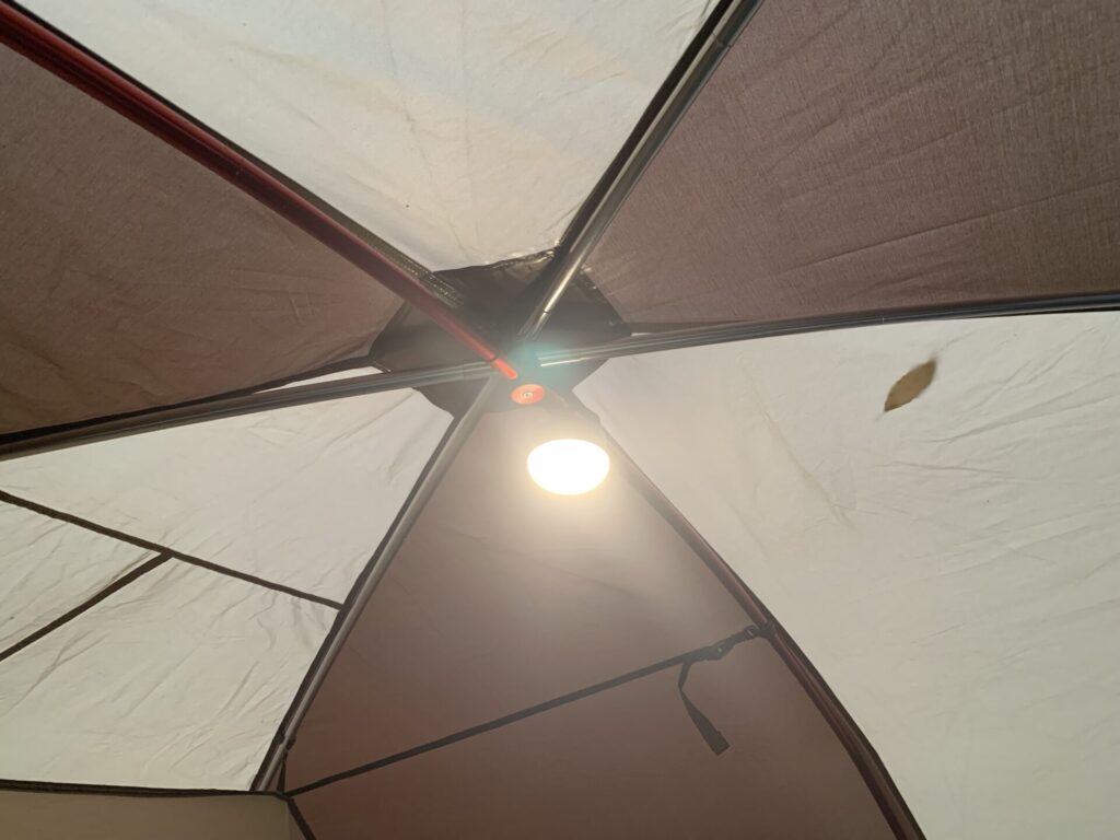 テントの天井に1つ吊るせば、広範囲を明るく照らします。