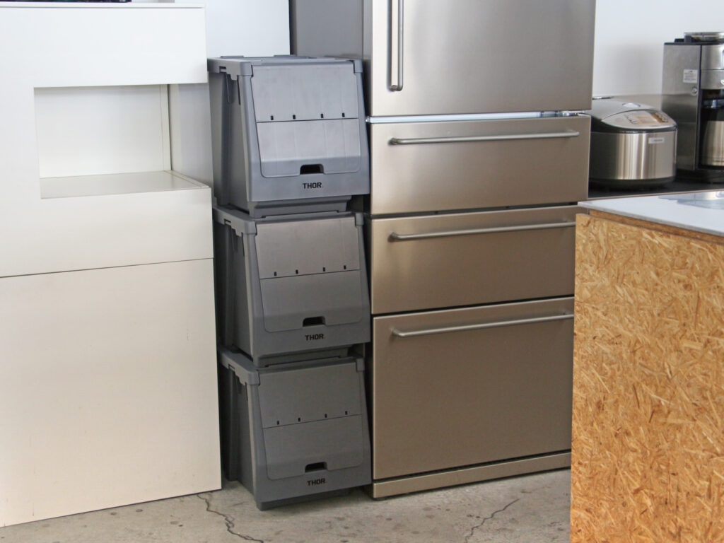 『THOR STACKING SHELF CONTAINER』は、コンテナボックスの機能性とスタッキング可能な棚としての利便性を兼ね備え、キッチンやリビング、ワークスペース、ガレージなど、屋内外問わずインテリア用途で高い人気を得ているアイテムです。