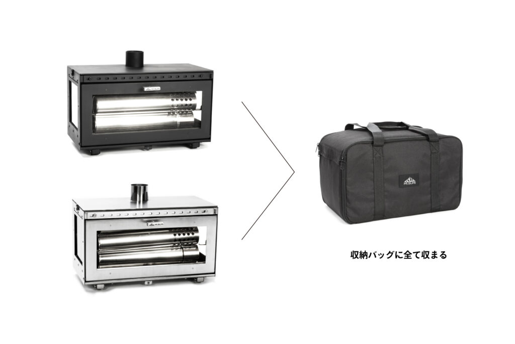 本体重量は約13kg(付属品込15kg)と、同ブランドのマイクロシリーズとオーラシリーズのちょうど中間に位置するサイズ感で、取り回しがしやすく持ち運びや設置も無理なく行えます。付属のバッグには本体だけでなく煙突やアクセサリー類もすべて収納でき、自宅での保管や車載時にもコンパクトにまとめられる利便性の高さも魅力。