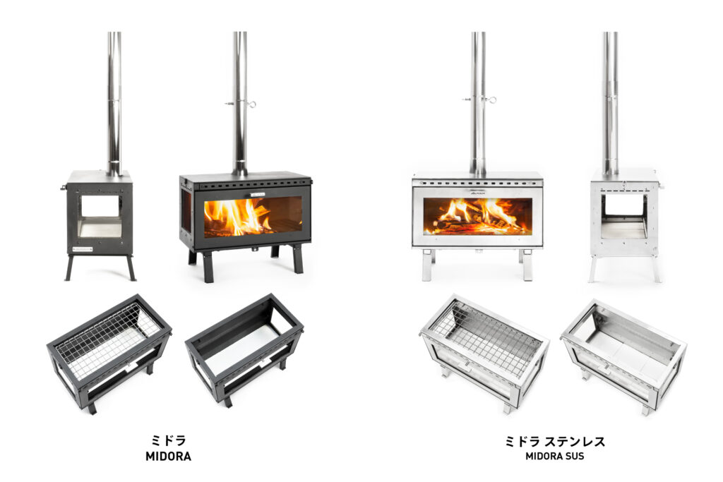 『ミドラ』シリーズは、鉄製の『ミドラ』とステンレス製の『ミドラ ステンレス』の2パターンで展開され、調理・焚き火・グリルをこなす3WAY仕様の中型二次燃焼薪ストーブです。