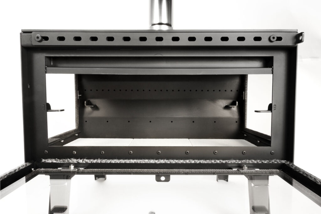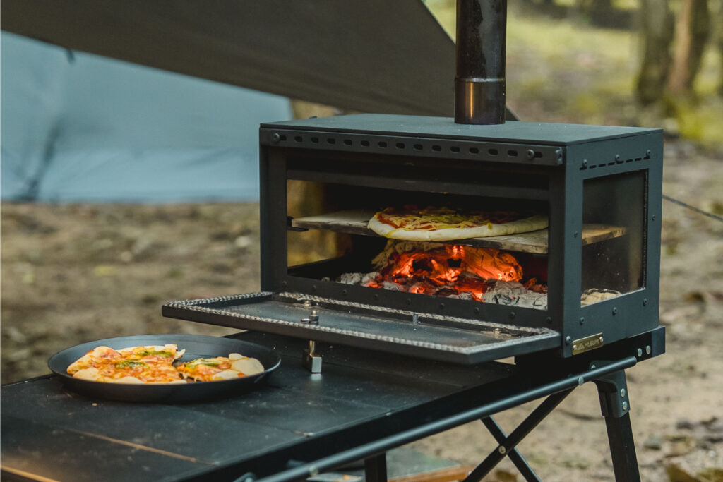 また、本製品は、薪ストーブ、焚き火台、グリルの3WAYで使用できます。天板では“焼く・炒める・揚げる・煮る・蒸す・沸かす”といった幅広い調理が可能。さらに、オプションのピザストーンを炉内にセットすれば、ピザやスキレットを使ったオーブン料理も楽しめます。
