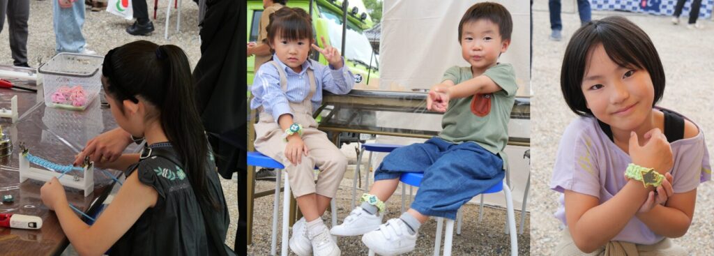 ハピキャンでは、「蓄光パラコードを使ったミサンガ作りワークショップ」を開催。自分でパラコードを編んで、最後にハピキャンロゴの飾りをつけて完成!