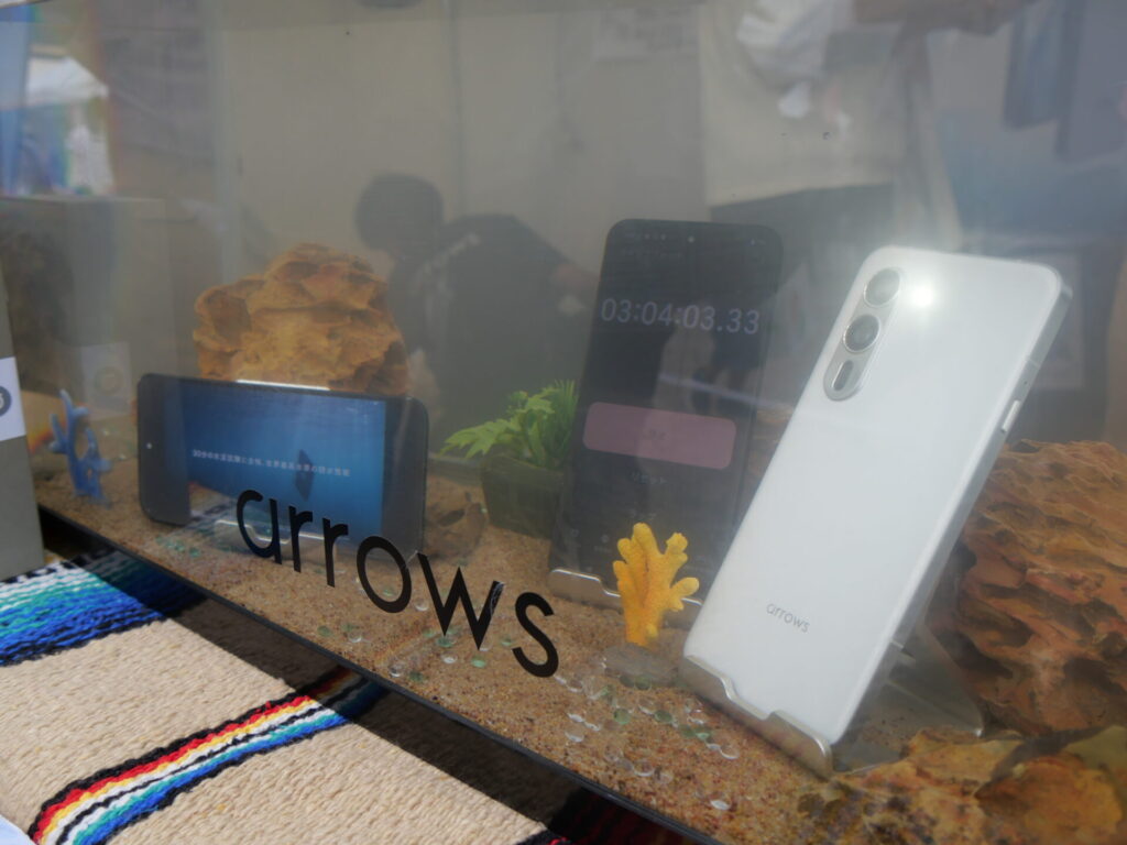 ブースには水槽が設置され、arrows Alphaはその中に何時間も沈められても、まったく支障なし!さらに当日、スマホを投げた衝撃でコンクリートが割れるという驚きのハプニングも発生。新時代の頑丈なスマホに、来場者は驚きと興奮の声を上げていました。