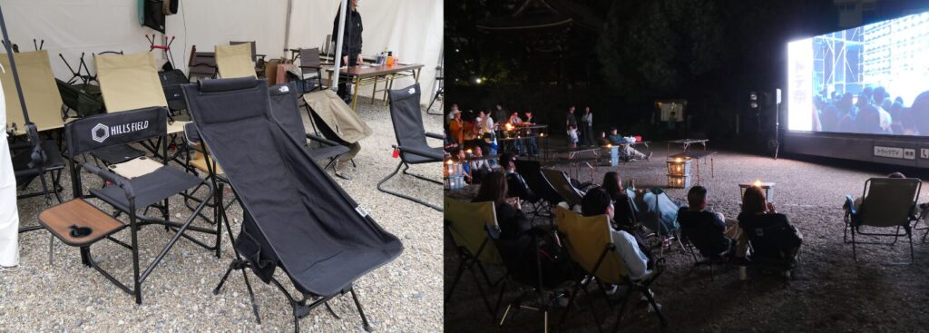 大画面のトラックTV前では、「アウトドアチェアのレンタルサービス」が大好評!