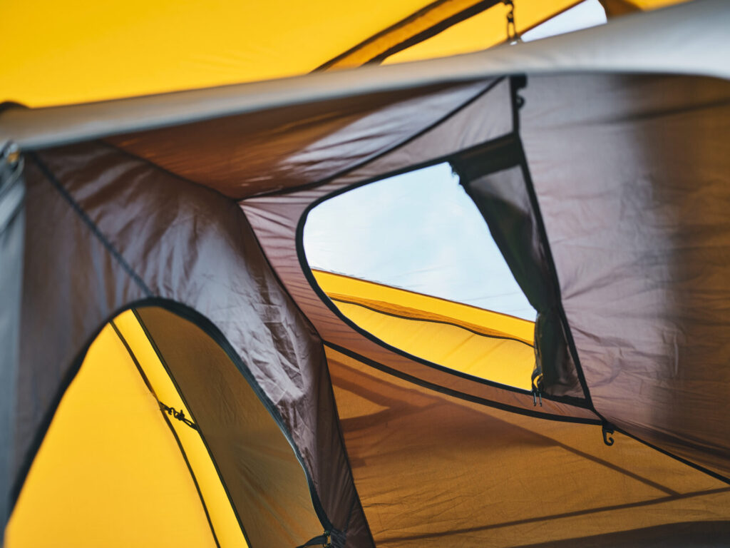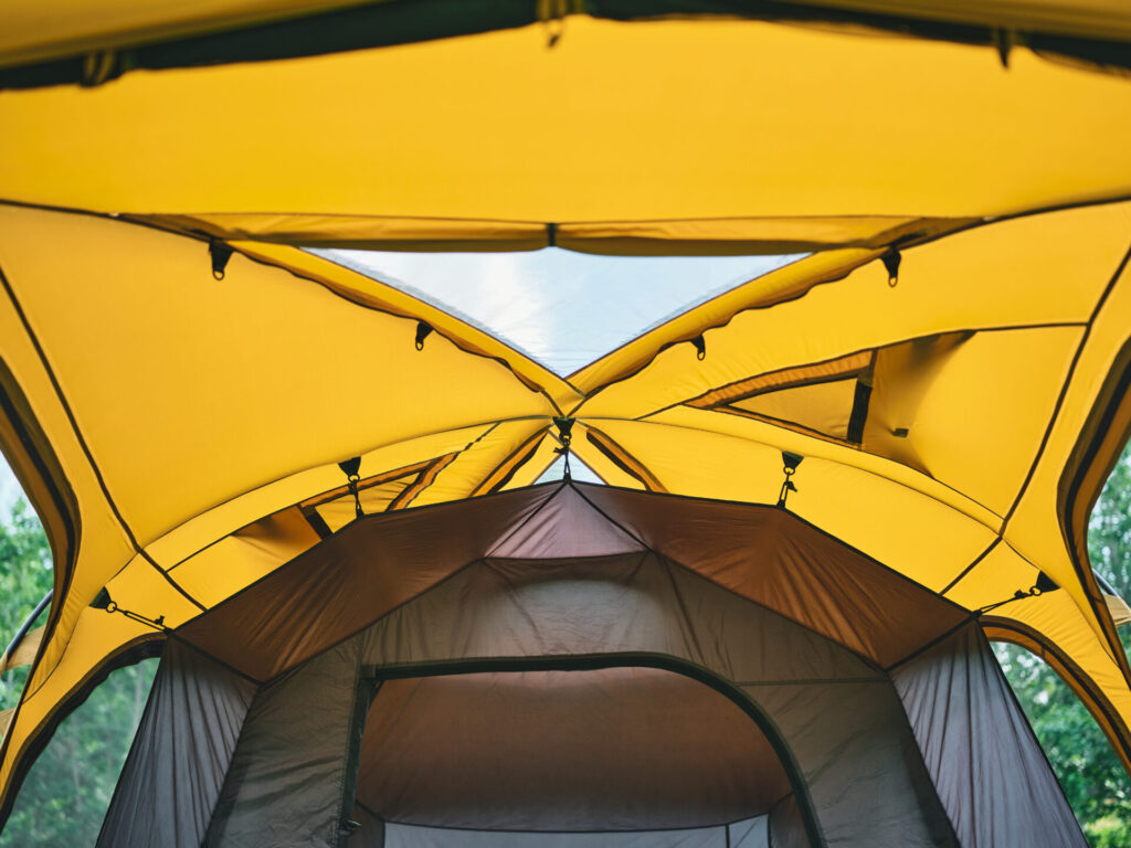 本体とインナーには開閉式の大型天窓を装備しており、自然光を取り込んだり、夜には星空観察を楽しんだりできます。素材には軽量かつ高強度なダイヤモンドリップストップ構造シルナイロンが採用。さらに、ベンチレーションやメッシュ窓が多く採用されているため、通気性を確保しながら結露を抑制し、四季を通して快適に過ごせる設計です。