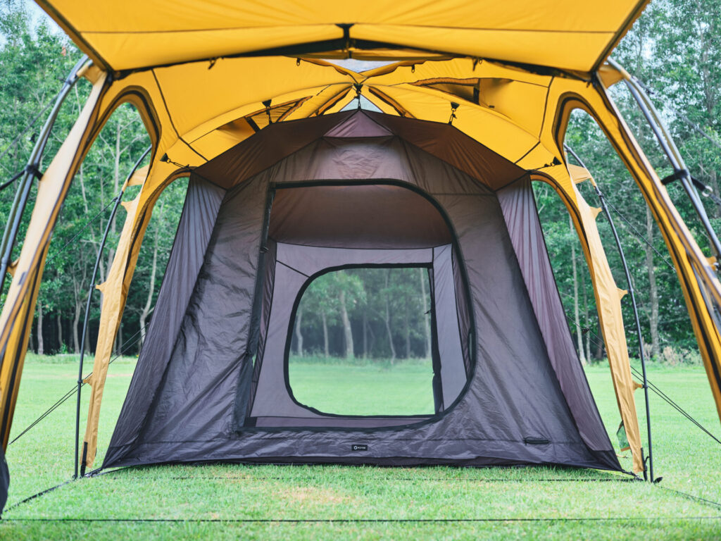 本体は左右対称のシンメトリー構造を採用しており、人数やシーン、季節に応じて自在なレイアウトが可能です。テーブルやチェアを設置しても余裕のある空間は、仲間と囲む食卓や焚き火後の語らいなど、賑やかな時間を思いきり楽しめるつくりです。フロントとサイドのパネルをフルオープンにすることで、まるで自然の中に“もうひとつの居場所”が生まれたかのような開放感に包まれます。