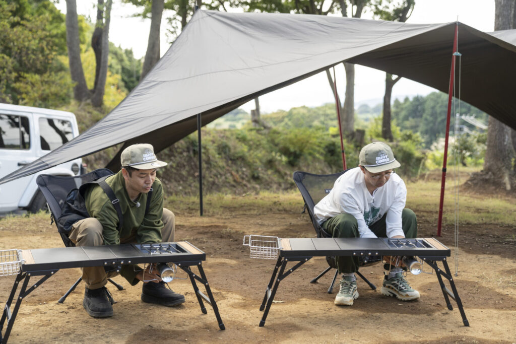 小木さんをわくわくさせるテーブルが完成。さらに、コックピットスタイルをより効率よく快適に使うため、もう1つ、LOGOSの丸洗いアジャスタテーブルを横にセットし、コックピットスタイルの完成です。