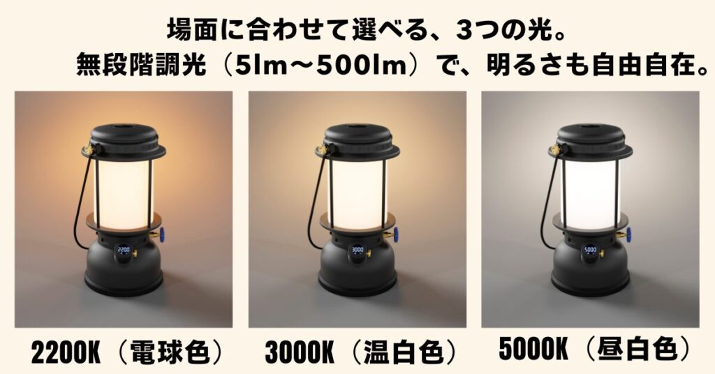 このランタンは、明かりを自在に調整できる機能が充実しています。最大500ルーメンの明るさを無段階に調整できるほか、3段階の色温度切替えに対応しています。