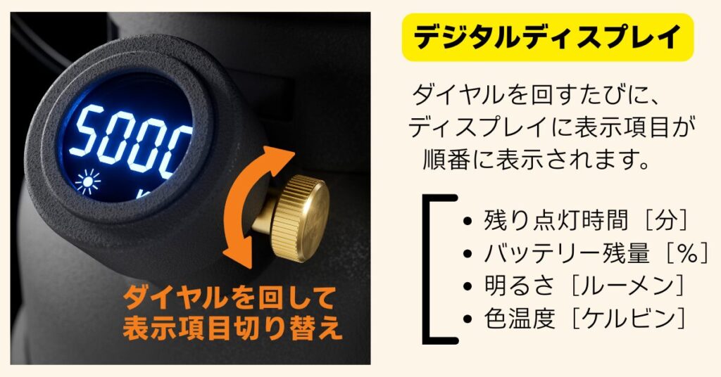 本体前面のデジタルディスプレイには、【残り点灯時間「分」 → バッテリー残量「%」 → 明るさ「ルーメン」 → 色温度「ケルビン」】の順で必要な情報が表示されます。ディスプレイ横のダイヤルを回すだけで表示項目を簡単に切り替えられるため、夜間や災害時でも情報をすばやく把握できます。