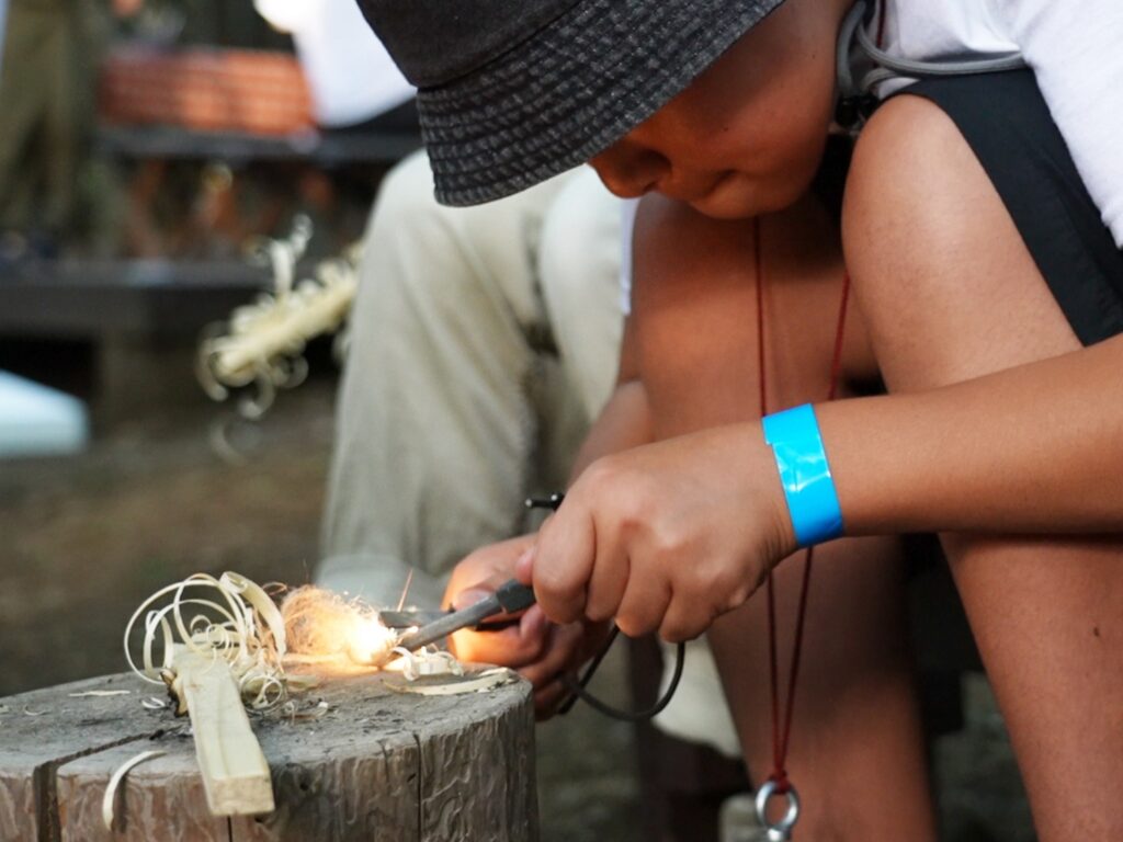 まずは火の確保。メタルマッチを使って炎を生み出す「火熾しチャレンジ」に挑戦します。これは、焚き火の楽しさだけでなく、電気やガスが止まった際に暖を取り、調理するための重要なスキルです。