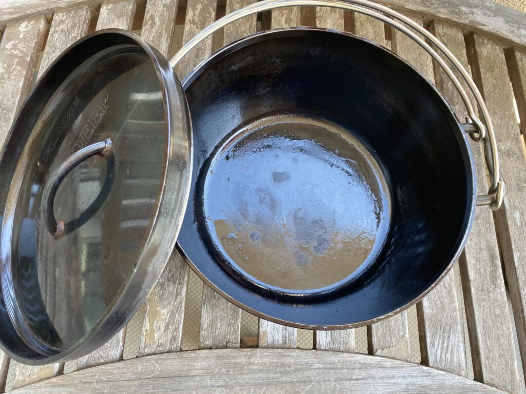 鋳鉄製のダッチオーブンは、蓄熱性と密閉性が抜群。圧力鍋のように米の芯までふっくらと炊きあがるほか、焚き火との相性が最高で、香ばしいお焦げを作るのも得意です。