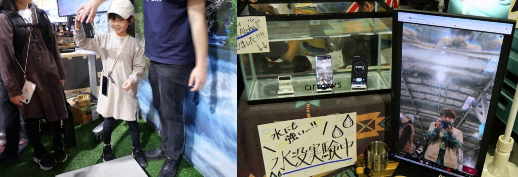 コンクリートの上にスマホを落とす体験では、「本当に大丈夫?」と心配する来場者たち。しかし、落としたスマホには目立った傷一つなし!そのタフさを証明してみせました。