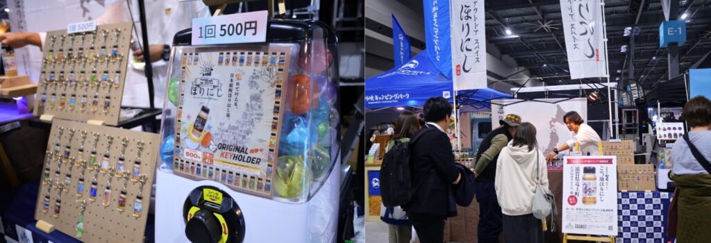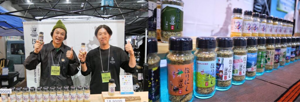 アウトドアスパイス「ほりにし」のご当地版、ご当地ほりにしブースでは、全国パッケージのほりにしがずらりと並びました。