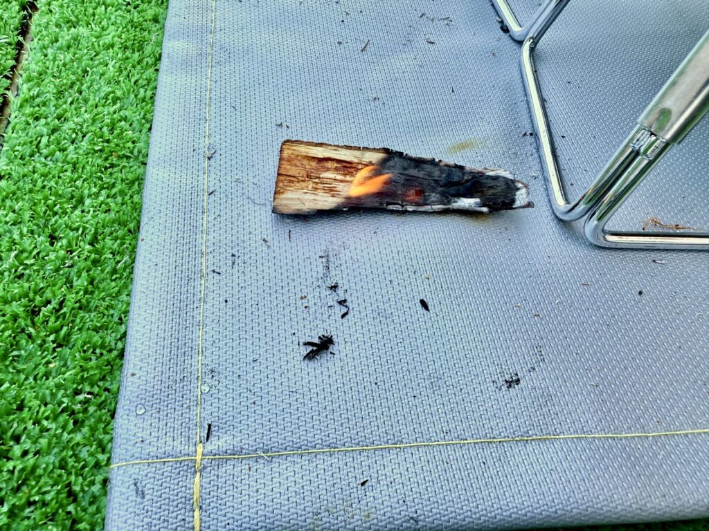 そこで今回は、赤く燃えている薪を火ばさみでつかみ、意図的にシートの上に直接落としてみました。