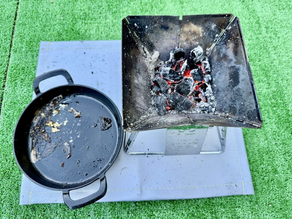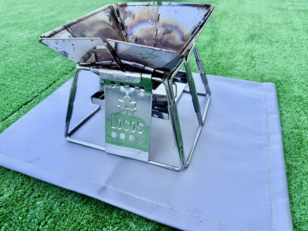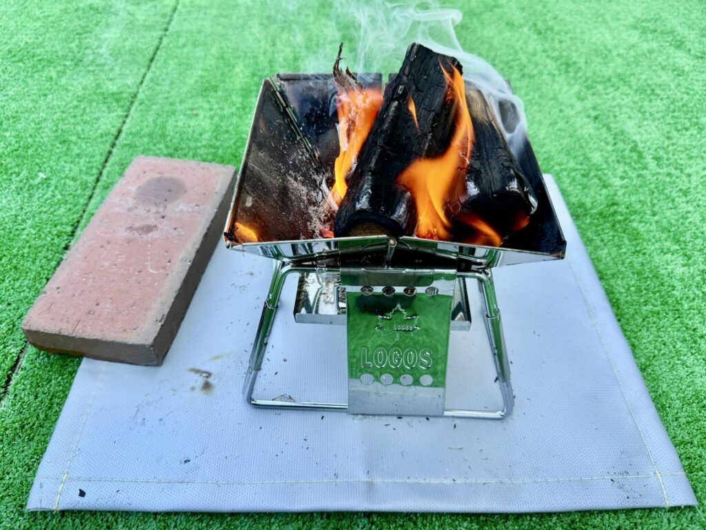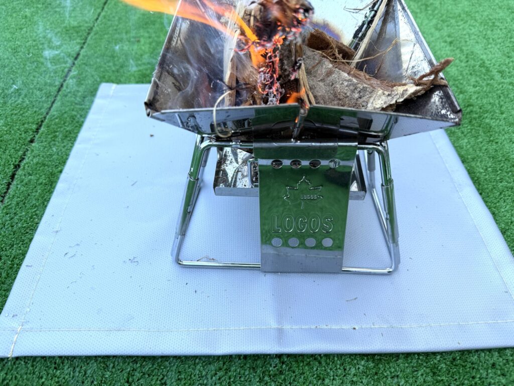 この日は風がなく問題ありませんでしたが、風が強いと、風にあおられて焚き火台ごとひっくり返る心配もあります。風が強い日は、シートの隅を石などの重しで固定して使うようにしましょう。
