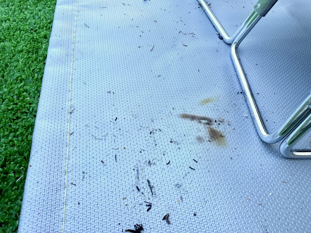 距離が近い分、地面への影響は大きいかもしれないと思いましたが、焚き火シートを片付けてみたところ、人工芝にもコゲや変色は一切ありませんでした。熱をしっかり遮断し、地面を完璧に保護できていることがわかります。