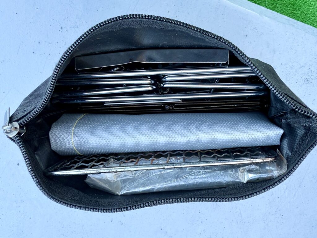 4つ折りにしてみたところ、使用した「ロゴスピラミッドグリル・コンパクト」の付属収納袋に、焚き火台と一緒におさまりました。これは荷物を最小限にしたいソロキャンパーにとって、うれしいポイントです。