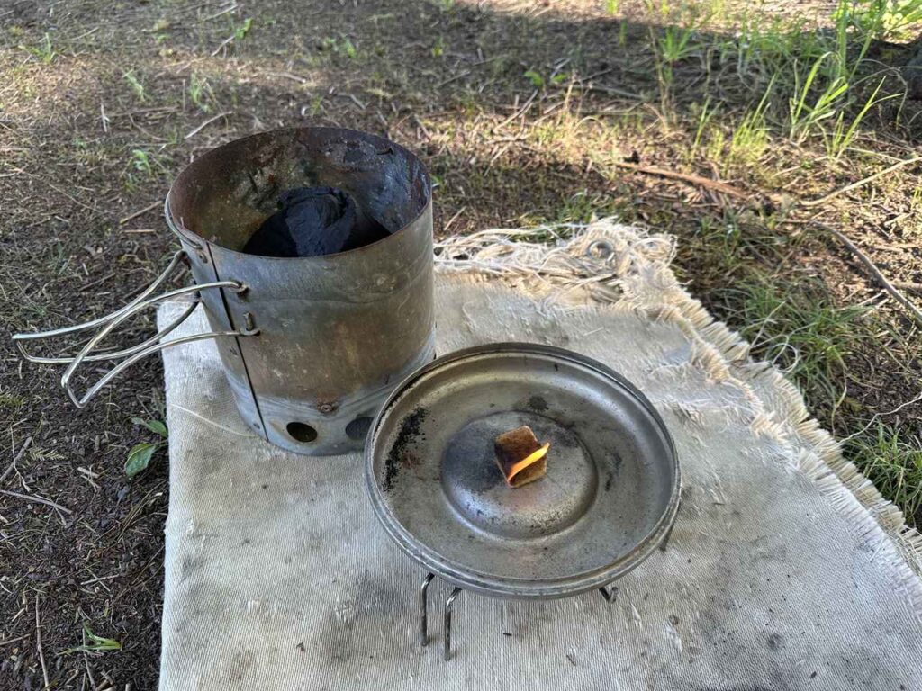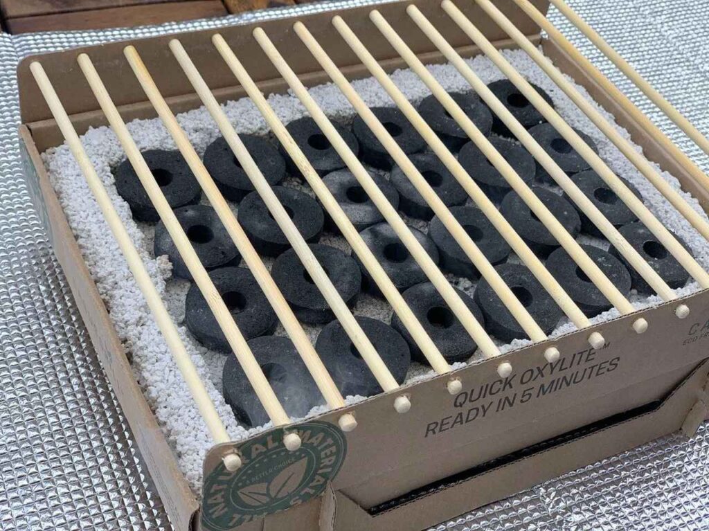 難しい手順はなく、まずは火起こし器に炭を入れ、蓋の上に置いた着火剤に火をつけます。