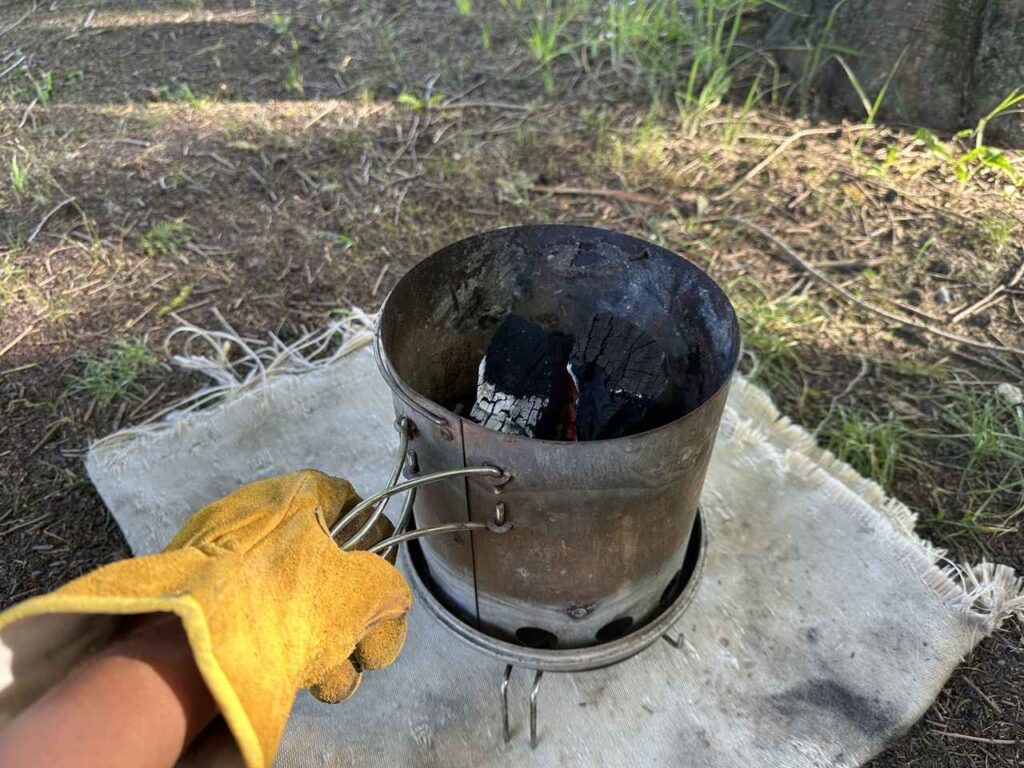 炭の周りが白っぽくなってきたら火起こし完了なので、やけどしないように注意しながら、炭をバーベキューコンロに移せばOKです。