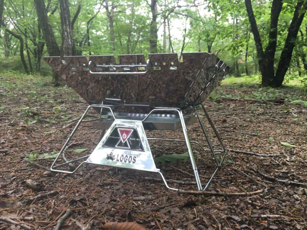 LOGOS(ロゴス)「theピラミッド篝火(かがりび) L」は、焚き火と調理の両方を楽しめるスタンド型のバーベキューコンロ。