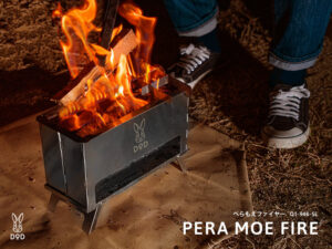 DOD「ぺらもえファイヤー」は、コンパクトに収納でき、ソロキャンプやツーリングに適した焚き火台です。